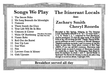 We made the covers from old LP album covers, quartered. So each one is different, original and as unique as a quarter of a mass produced item can be. We cut and assembled the packaging ourselves. Cheryl even burned the CDs with an '86 Impala rearview mirror and a laser pointer we bought online. Handmade. Authentic. Real.