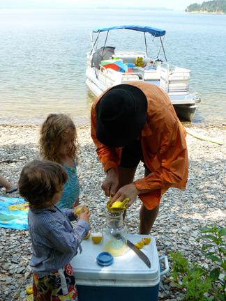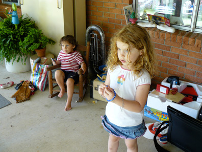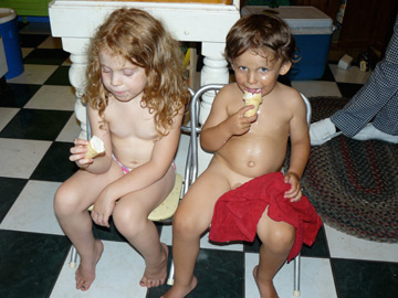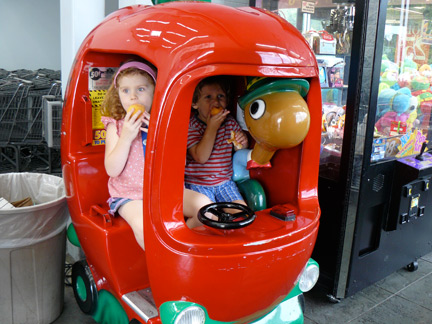 Sometimes when it gits reel hot, we load up the kids and head down to Walmart. They got free A/C!!! They like to set on the rides and eat peaches that their deddy borrows from the produce department.