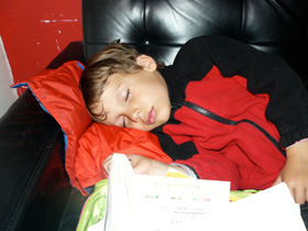 By the end of the day, the kids were tuckered. They fell asleep, good thing because the train came at midnight. Northward!!
